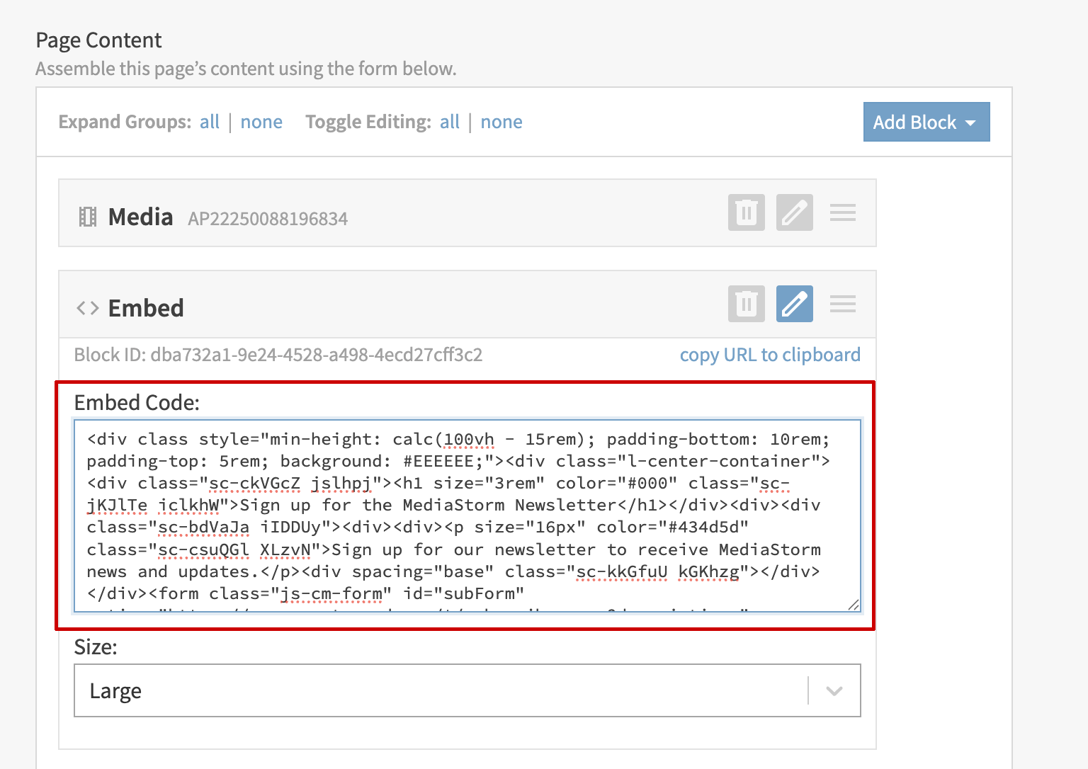 To add a form to a content area, add a new Embed block by clicking the New Block button and selecting Embed.