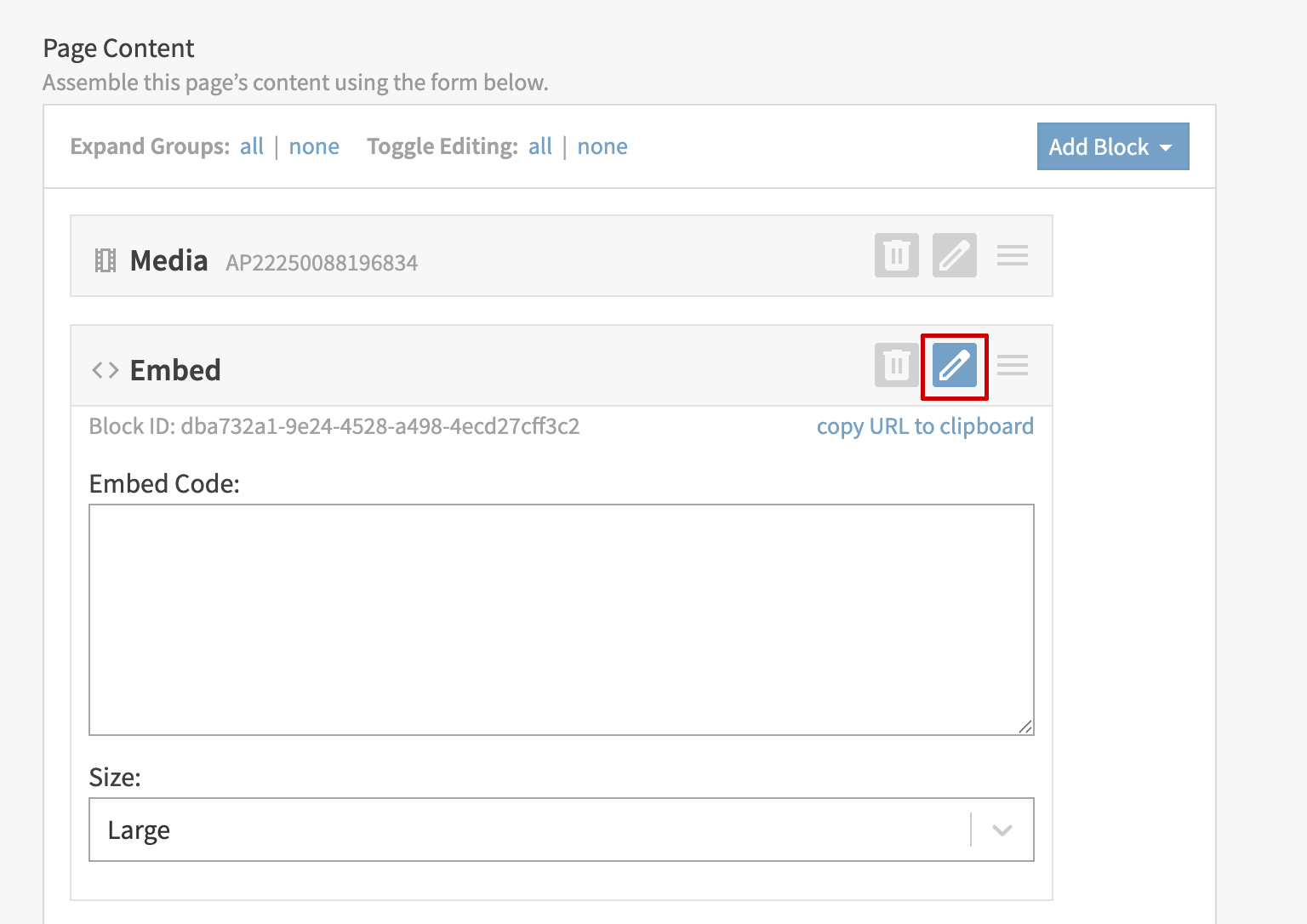 To do this, you will use the embed block when editing content.