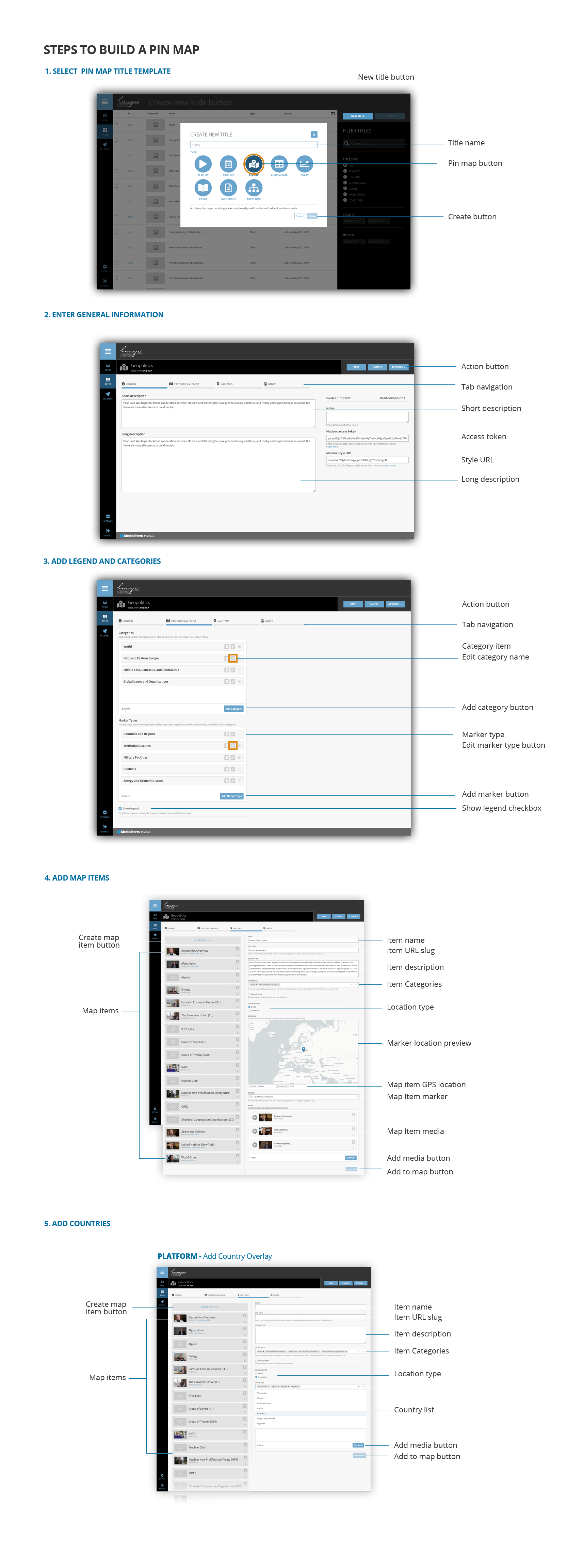 A Pin Map is built by creating map items. Map items can be either points (displayed as Markers) or countries. Map items can be grouped and arranged into categories that are viewed in navigation menu.
